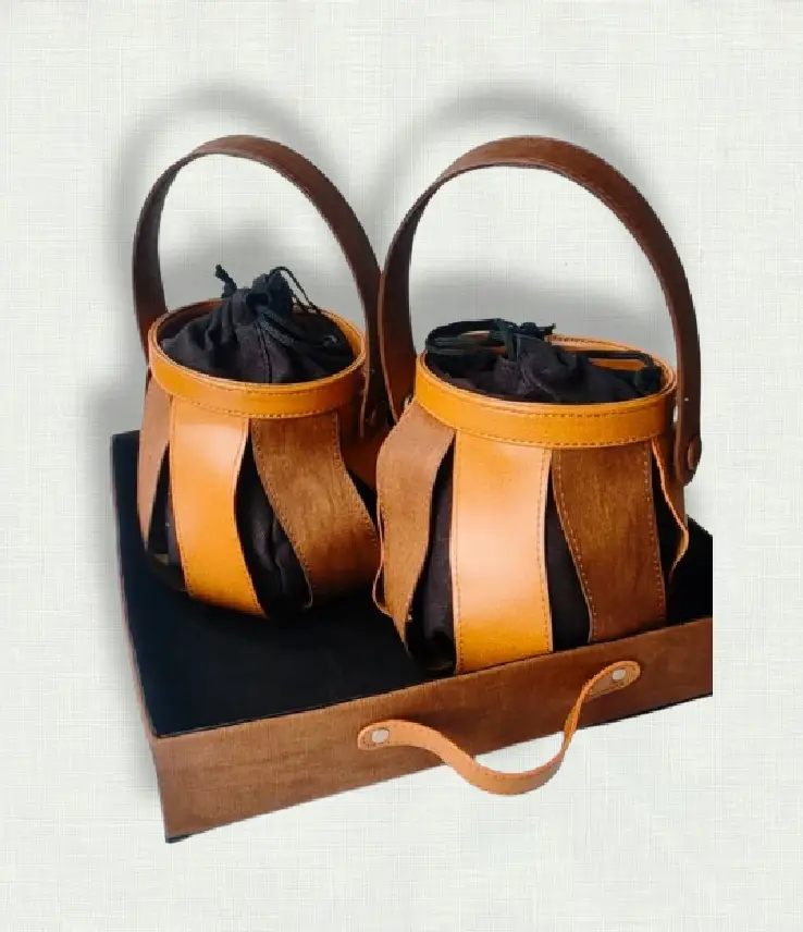 Combo set- 3 comprises of basket and potlis. This can be used as wedding hampers, dry fruit hampers, festival and occasion gifting, baby shower hampers, /Leatherette.