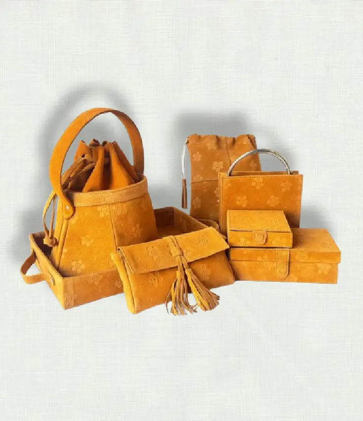 Combo yellow set- 7 comprises of a Hamper basket, Big and small potli, Money envelope, Carry Bag, Cash box, and Moneybox. This suede combo is the perfect gifting option for weddings, festivals, and occasions. This embossed flowery look set is very innovative and a perfect giveaway option.