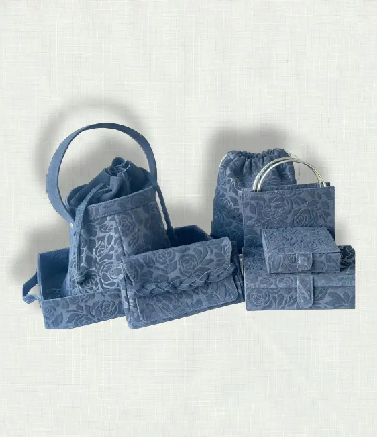 Combo blue set- 7 comprises of Hamper basket, Big and small potli, Money envelope, Carry Bag, Cash box, and Moneybox. This suede combo is the perfect gifting option for weddings, festivals, and occasions. This embossed flowery look set is very innovative and a perfect giveaway option.